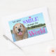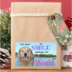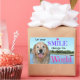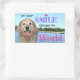 This design features a photograph of a smiling golden retriever dog surrounded by blue skies and water. The quote reads, "Let your smile change the world."