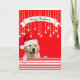 Cute golden retriever on red and white candy cane stripes with Santa cap for Christmas.