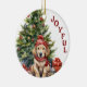 On the front of this Holiday ornament is the image of a Golden Retriever Dog wearing a red and white Santa hat and scarf. The dog sits in front of a decorated Holiday tree. Red text at the side says "JOYFUL". On the back, red and green text says MERRY CHRISTMAS", and there are additional text fields for you to customise. Make it say whatever you'd like!