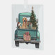 A teal blue retro pickup truck carries a decorated Holiday tree and gift packages on this cute glass Christmas ornament. Looking out from the tailgate is a beautiful Golden Retriever dog. A rustic wooden sign on the back bumper says "Christmas Cheer".