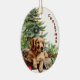 On the front of this Holiday ornament is the image an attentive Golden Retriever Dog laying in his wicker basket bed in front of a decorated Christmas tree. Curved red text at the side says "CHRISTMAS". On the back, red and green text says MERRY CHRISTMAS", and there are additional text fields for you to customise. Make it say whatever you'd like!