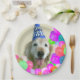 Add a little golden retriever cheer to your next party with these cute paper plates! Design features a photograph of a smiling golden retriever dog who is wearing a birthday hat and surrounded by colourful balloons! Matching party supplies available!