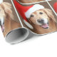 Add a little golden retriever Christmas cheer to your holiday packages this year! This wrapping paper features a photograph of a smiling golden retriever dog wearing a red Santa hat.