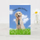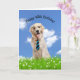 Golden retriever with striped necktie and eyeglasses in grass and flowers for 45th birthday.