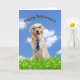 Golden retriever with striped necktie and glasses in grass and flowers for retirement.