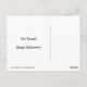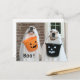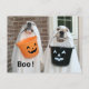This postcard features two golden retriever dogs dressed as Halloween ghosts! They are wearing white sheets and carrying orange and black treat buckets with jack-o-lantern faces. Text on front reads, "Boo!" while text on back reads, "Got Treats? Happy Halloween!" Text is fully customisable.
