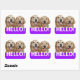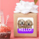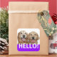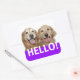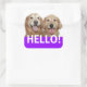 Say Hello! These stickers feature a photograph of two smiling golden retriever dogs, with the word HELLO! in white on a purple background.