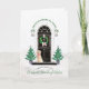 Featuring a smiling Golden Retriever wearing a pink knit scarf! A classic front porch decorated for the holidays, featuring Christmas trees with stars flanking the elegant black door, a pine wreath with pink gingham bow, and lanterns topped with roses and holly. In the style of Magnolia | modern farmhouse | classic elegant. 3 COLORS OF PLAID FOR THE INSIDE ARE IN THE DESIGN (black as shown, dark green, or pink - just edit and hide the ones you don't want).