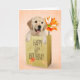 Cute golden retriever in a generic brown paper bag with orange gerbera daisy for 60th birthday.