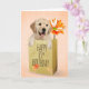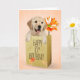 Cute golden retriever in a generic brown paper bag with orange gerbera daisy for 85th birthday.