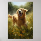 Looking for a way to brighten up your home or office with a touch of joy and whimsy? Look no further than our unique poster featuring a happy Golden Retriever, captured in an artistic photographic portrait set against a stunningly colourful sunlit meadow backdrop.