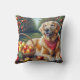 A golden retriever with a red bandanna sits next to a wicker basket of apples in an orchard