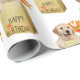 Cute golden retriever in a generic brown paper bag with orange gerbera daisy on white background.