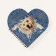 Golden retriever in frayed blue jean hole.