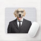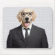 Golden retriever dog in black business suit and black framed eyeglasses on brick wall background.