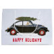 Golden retriever dog driving a retro black car in snowflakes with green Christmas pine tree on roof.