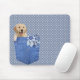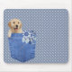 Cute golden retriever in blue jean pocket with daisies on blue and white polka dot background.