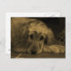Cute and thoughtful looking dog, this golden retriever is laying down resting his head on his paws. A loyal pet with a gentle melancholy look to him. The sepia tones of the photograph give it an old-fashioned, western vintage feel.