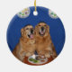 This ornament features golden retrievers wearing yarmulkes with a seder plate. This ornament would make a perfect Passover decoration or gift.