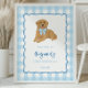 Welcome your guests in the sweetest way with this blue gingham golden retriever first birthday poster! Featuring a darling golden retriever puppy with a blue gingham bow and a classic chequered background, this personalised birthday poster adds a heartwarming touch to your little one’s special day.