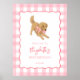 Welcome your guests in style with this adorable pink gingham golden retriever first birthday poster! Featuring a sweet golden retriever puppy with a pink gingham bow and a classic chequered background, this personalised birthday sign adds a warm and playful touch to your celebration.