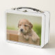 This is a standard metal lunchbox that appears to work just fine. We designed this box ourselves with an uploaded photo and custom text on the front and back. It looks absolutely beautiful except the front of the lunchbox is not centered like it shows in the photo. The print borders don't align with the inset flat part of the box where the preview photo online showed it perfectly centered in there. The back looks nice and centered though.