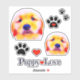 Here's a grouping of cute and vibrant dog stickers! Designs feature two vibrant art paintings of a cute golden retriever puppy, rendered in shades of blue, yellow and orange, black paw prints, a red heart, and the phrase "puppy love."