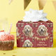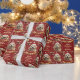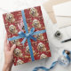 The repeated pattern on this pretty Christmas wrapping paper is a portrait of a beautiful Golden Retriever wearing a red and white Santa Claus hat. Along with the dog images is an elegant matching red banner decorated with gold design pennants at the top. Your custom text is in pale gold in three fields for you to customise.