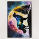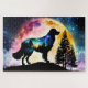 silhouette of Golden Retriever on the mountain in front of a colourful full moon