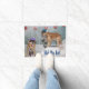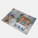 This door mat features golden retrievers wearing scarves, hats, and using skis to ski on the puppy slope. The text on this welcome mat reads, "Ski On In!".