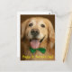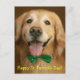 This post card features a photograph of a smiling golden retriever dog who is wearing a green bow tie. The text reads, "Happy St. Patrick's Day!" and "Kiss Me! I'm Irish!" but it can be altered or deleted to suit your needs.
