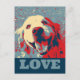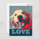 This postcard features a closeup of a smiling golden retriever dog, done in the "hope" stencil style with red, white and blue colours, along with the word love.