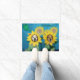These golden retrievers are dressed as sunflowers. The message reads, "Welcome!".