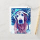 This postcard features a vibrant blue art portrait of a golden retriever dog who is wearing a cute winter hat, and standing in the snow. Customisable back text reads, "Warm Winter Wishes."