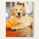 A 12 week-old Golden Retriever puppy rests with a plush basketball toy between his paws in his owner's home.