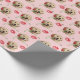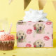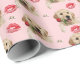 Golden retriever with red rose and red lipstick kisses on blush pink background.