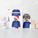 Golden retriever dog with blue Christmas ugly sweater and Santa Claus hat on white background.