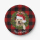 Golden retriever in Christmas wreath with glowing coloured lights and snowflakes on red and black buffalo plaid.