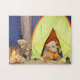 This puzzle features golden retrievers going camping. One is toasting marshmallows by the fire, while the other relaxes in the tent.