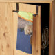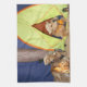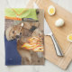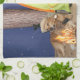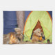 This kitchen towel features golden retrievers in a camping scene. One golden retriever is toasting marshmallows by the fire, while the other golden hangs out in the tent.