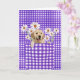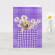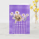 Cute blonde golden retriever dog in purple and white gingham pocket with daisies for general birthday.