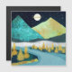 A beautiful landscape with unique textures showing a river and mountain landscape with a rising moon and starry sky in shades of blue, gold, dark green, and yellow.