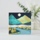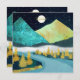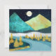 A beautiful landscape with unique textures showing a river and mountain landscape with a rising moon and starry sky in shades of blue, gold, dark green, and yellow.