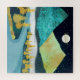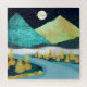A beautiful landscape with unique textures showing a river and mountain landscape with a rising moon and starry sky in shades of blue, gold, dark green, and yellow.