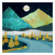 A beautiful landscape with unique textures showing a river and mountain landscape with a rising moon and starry sky in shades of blue, gold, dark green, and yellow.