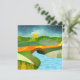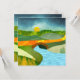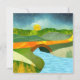 Abstract landscape scene of a river going under a stone bridge with rolling hills and a golden road in bold colours and textures.