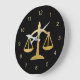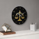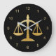 A clock with an image of golden scales on a black background. Simple and elegant.