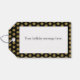 An elegant gift tag with a black background and a gold coloured snowflake pattern. The front has a gold coloured ribbon. On the the back there is an area for your holiday message.