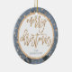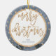 Christmas ornament with golden effect (faux, printed as an image) stars, Merry Christmas and customizable blue text, where you can add your family name. It's double-sided circle ceramic ornament and it measures 2.87 inches by 2.87 inches and weights 1.4 ounces.