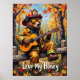 This delightful painting portrays a bear dressed as a firefighter, wearing sunglasses and a helmet, strumming an acoustic guitar while perched on a weathered wooden fence. The background is a vibrant autumn forest with trees in full fall foliage and scattered leaves on the ground. The thick, textured brushstrokes enhance the whimsical and sweet nature of the scene, with "Love My Honey" prominently displayed.